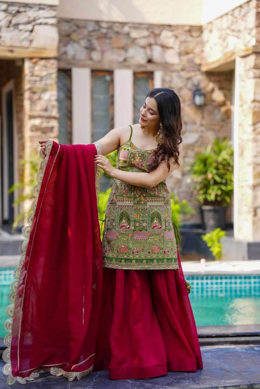 Dupatta – Organza dupatta embellished with sequence and zari work, finished with a graceful lace border for a festive touch